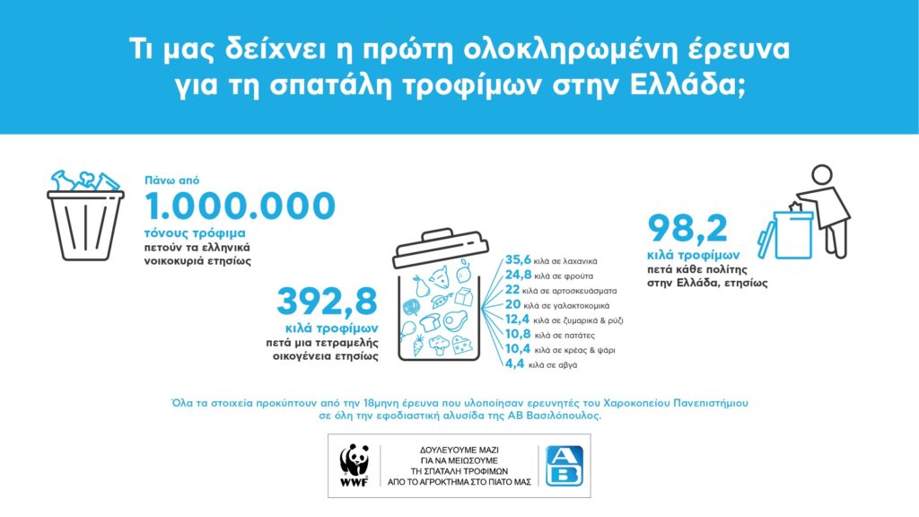 Τα στοιχεία της έρευνας έρευνα του Χαροκοπείου Πανεπιστημίου αποκαλύπτουν ότι κάθε χρόνο στην Ελλάδα, τα ελληνικά νοικοκυριά πετούν πάνω από 1.000.000 τόνους τροφίμων, τα μισά εκ των οποίων θα μπορούσαν με ασφάλεια να καταναλωθούν και όχι να καταλήξουν στα σκουπίδια. Επιπλέον, η σπατάλη τροφίμων στον οικιακό τομέα ξεπερνά το 50% της συνολικής σπατάλης και κάθε πολίτης στην Ελλάδα, πετά κάθε χρόνο 98,2 κιλά τροφίμων από το νοικοκυριό του, ενώ για μια τετραμελή οικογένεια, το νούμερο αυτό αγγίζει τα 392,8 κιλά τροφίμων ετησίως. Παράλληλα, η σπατάλη τροφίμων προκαλεί ανυπολόγιστη σπατάλη φυσικών πόρων, οι οποίοι διατίθενται για την παραγωγή τροφίμων που τελικά δεν καταναλώνονται.