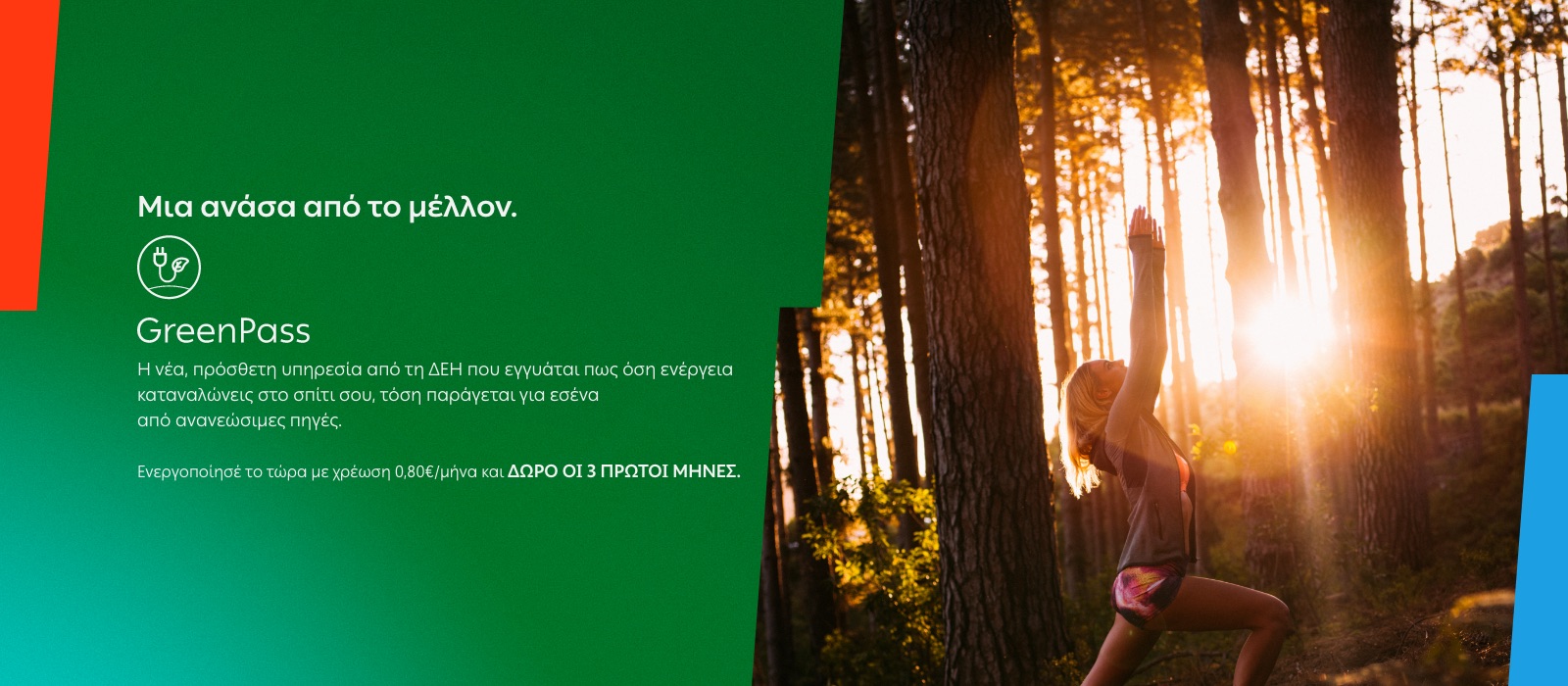 Το GreenPass είναι η νέα υπηρεσία της ΔΕΗ, του μεγαλύτερου προμηθευτή ενέργειας από Ανανεώσιμες Πηγές στην Ελλάδα (σύμφωνα με τα στοιχεία του ΔΑΠΕΕΠ για το Μίγμα Προμηθευτή του 2019), που εξασφαλίζει ότι όση ποσότητα ενέργειας καταναλώνει κάποιος στο σπίτι του, τόση ποσότητα παράγεται από Ανανεώσιμες Πηγές Ενέργειας και δεσμεύεται για την δική του κατανάλωση.