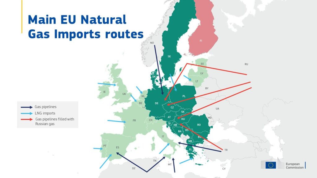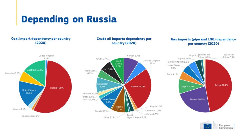 Σημειώνεται ότι η ΕΕ εισάγει το 90% της κατανάλωσης φυσικού αερίου της, με τη Ρωσία να παρέχει περίπου το 45% αυτών των εισαγωγών, σε διαφορετικά επίπεδα μεταξύ των κρατών μελών. Η Ρωσία αντιπροσωπεύει επίσης περίπου το 25% των εισαγωγών πετρελαίου και το 45% των εισαγωγών άνθρακα.