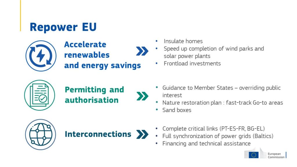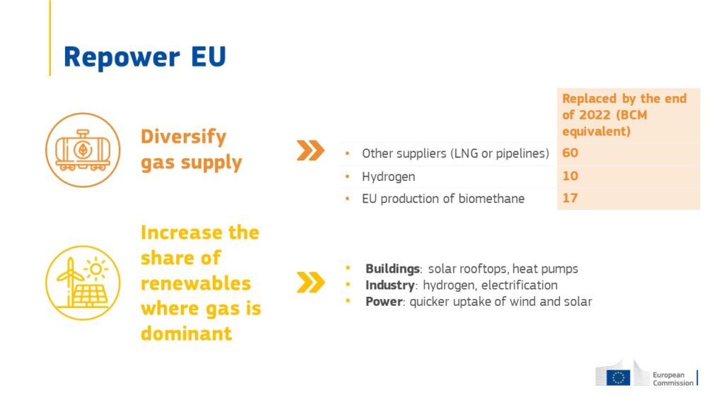 Το πρόγραμμα REPowerEU θα επιδιώξει να διαφοροποιήσει τις προμήθειες φυσικού αερίου, να επιταχύνει την ανάπτυξη ανανεώσιμων αερίων και να αντικαταστήσει το φυσικό αέριο στη θέρμανση και την παραγωγή ηλεκτρικής ενέργειας. Αυτό μπορεί να μειώσει τη ζήτηση της ΕΕ για ρωσικό αέριο κατά δύο τρίτα πριν από το τέλος του έτους, όπως φαίνεται από το σχέδιο της Ευρωπαϊκής Επιτροπής.